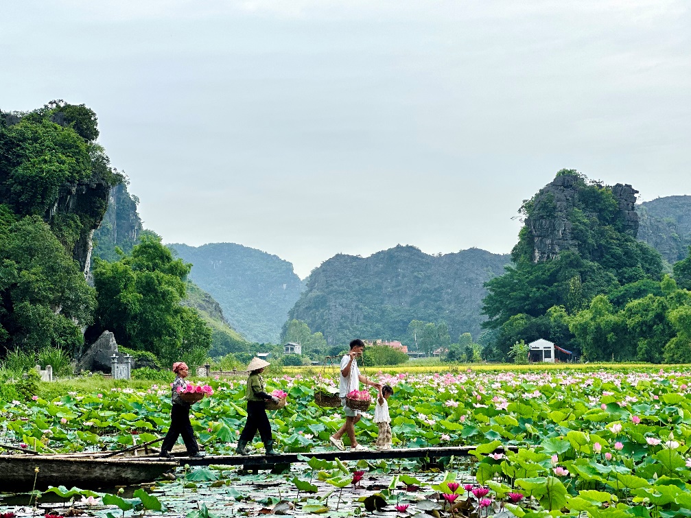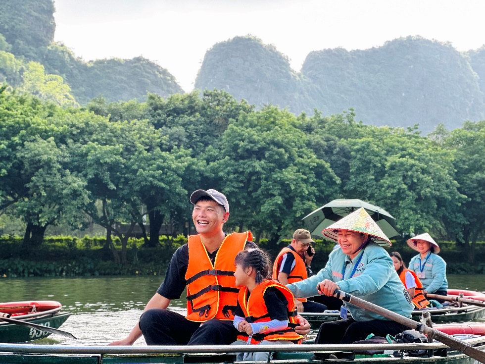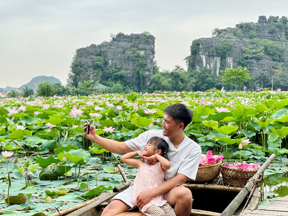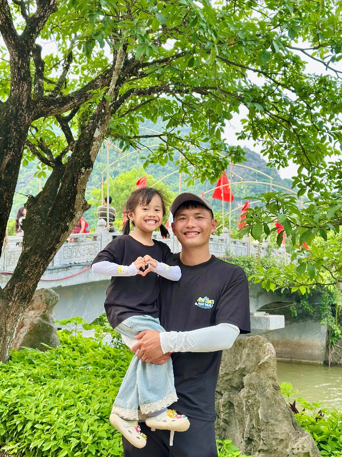 Hai bố con vui vẻ khi tham quan Tràng An