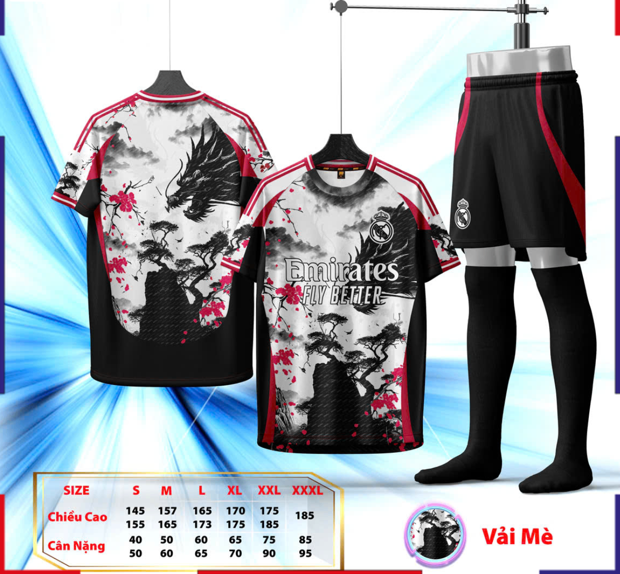 Mẫu áo bóng đá CLB Real Madrid trắng họa tiết rồng đen 2025–2026 mang phong cách mới lạ khi kết hợp cảm hứng Á Đông với tinh thần hiện đại châu Âu. Nền trắng thanh lịch đi cùng hình Rồng Đen mạnh mẽ và họa tiết cây tùng uy nghi, gợi lên thông điệp về sức mạnh, sự bền bỉ và tinh thần chiến đấu của đội bóng Hoàng Gia.